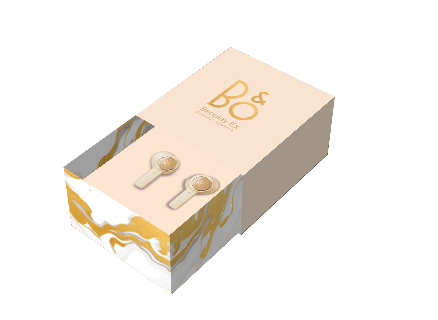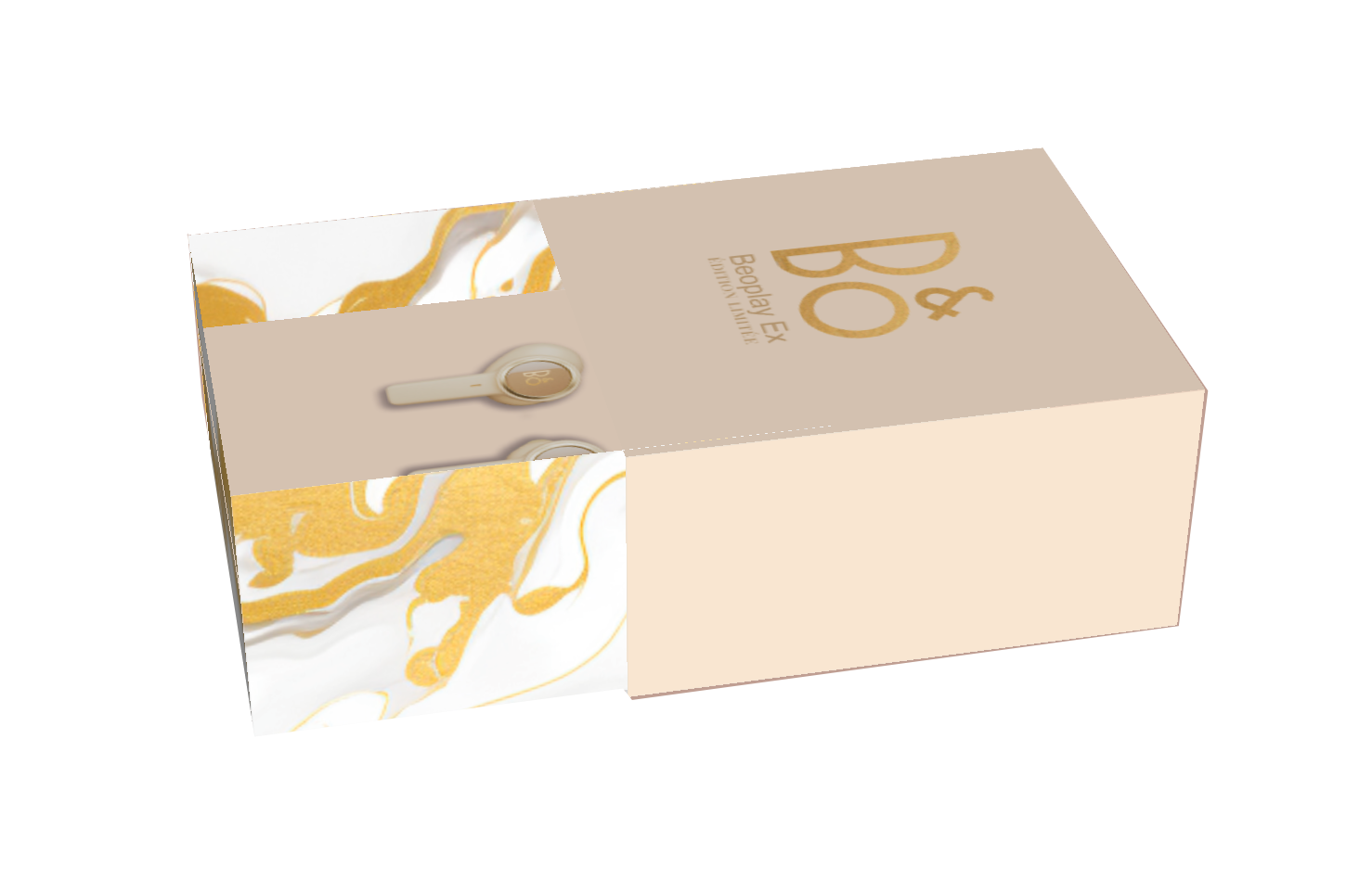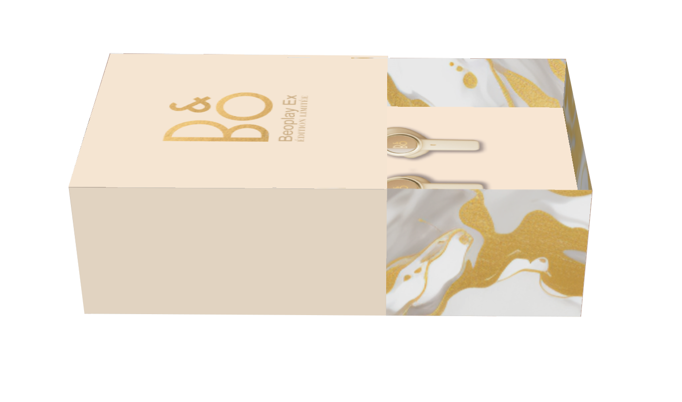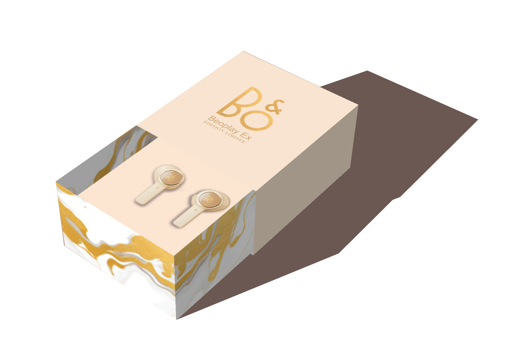 La boîte d’écouteurs est pricipalement de couleurs beige avec un motif en marbres avec des coulées dorés sur les cotés qui donne une combinaison d’élégance.